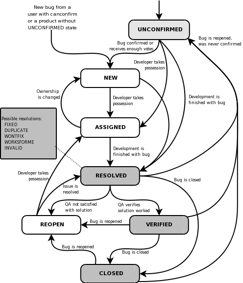The life cycle of a bug, also known as workflow, is customizable to match the needs of your organization, see Section 3.12. Figure 5-1 contains a graphical representation of the default workflow using the default bug statuses. If you wish to customize this image for your site, the diagram file is available in Dia's native XML format.